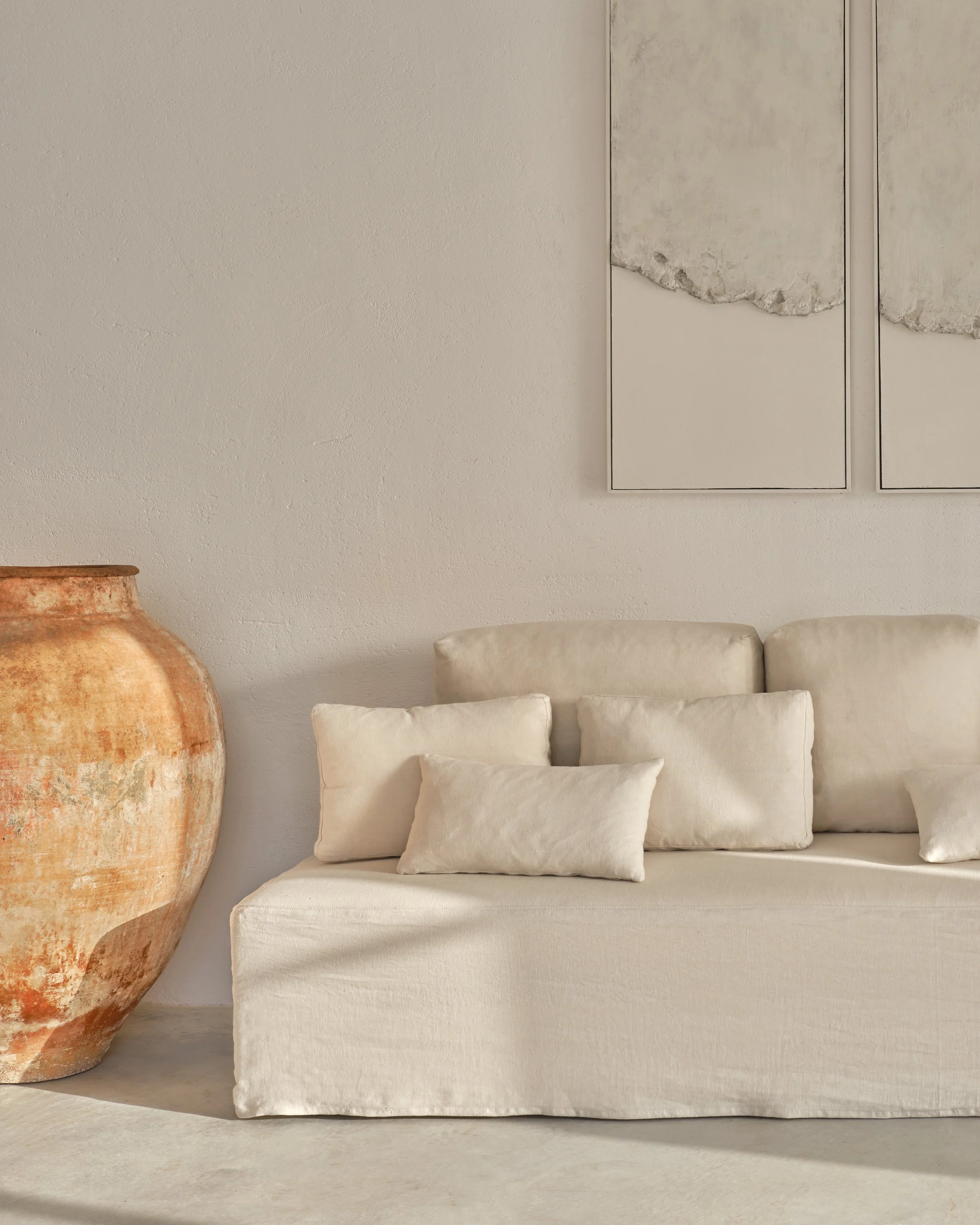 Ceglie is an example of a sofa suitable for any space, and perfect for modern living. The frame of the sofa is made of pine and beech wood, and lined with high quality organic foam, then upholstered. A foam and down cover is placed on top of the base, for added comfort. The cover is removable and made from organic linen, which can be dry cleaned only.